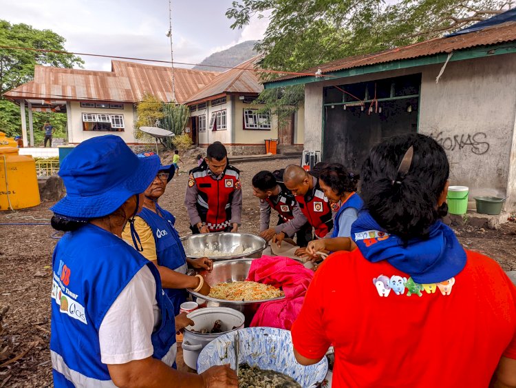 Perihatin dengan Keadaan tersebut Personel Bantuan Kendali Operasi (BKO) Polda Nusa Tenggara Timur (NTT) segera terjun kelapangan memberikan bantuan air bersih siap konsumsi dan makanan siap saji bagi warga pengungsi terdampak erupsi Gunung Api Lewotobi Laki-Laki, Sabtu (9/11/2024).
